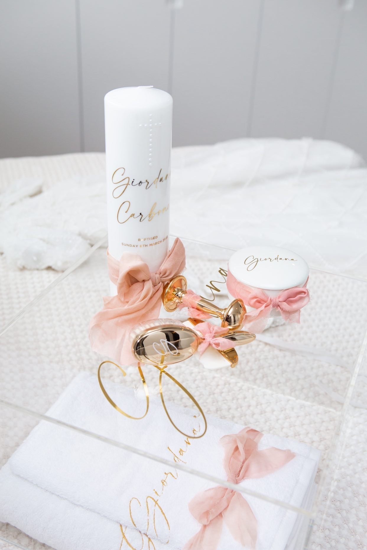Our Baptism Packages include a range of personalised items for you to use on the day, and the option to add a box to store all the items in.