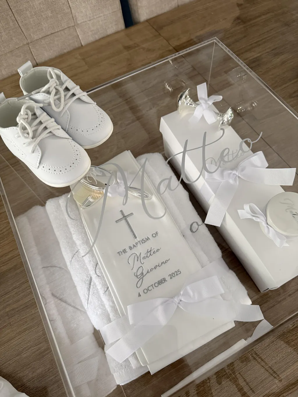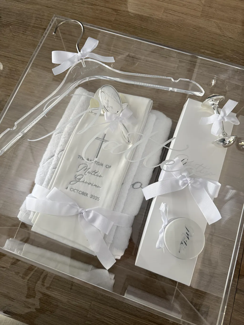 Acrylic Name includes first name only - if you wanted to add middle name, surname, date or cross or any other details - there will be an additional charge added.