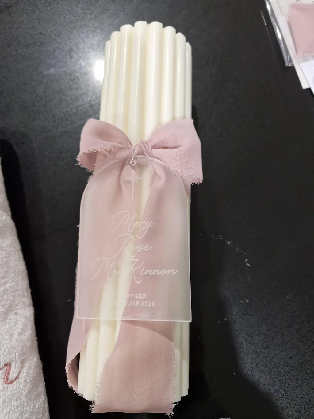 Purchasing this candle was the best decision, it was easy fun and the options were beautiful. The support and communication from the team at Bespoke was 10/10 and the candle arrived in perfect condition ready for our event. I would highly recommend using Bespoke Baby Co.
