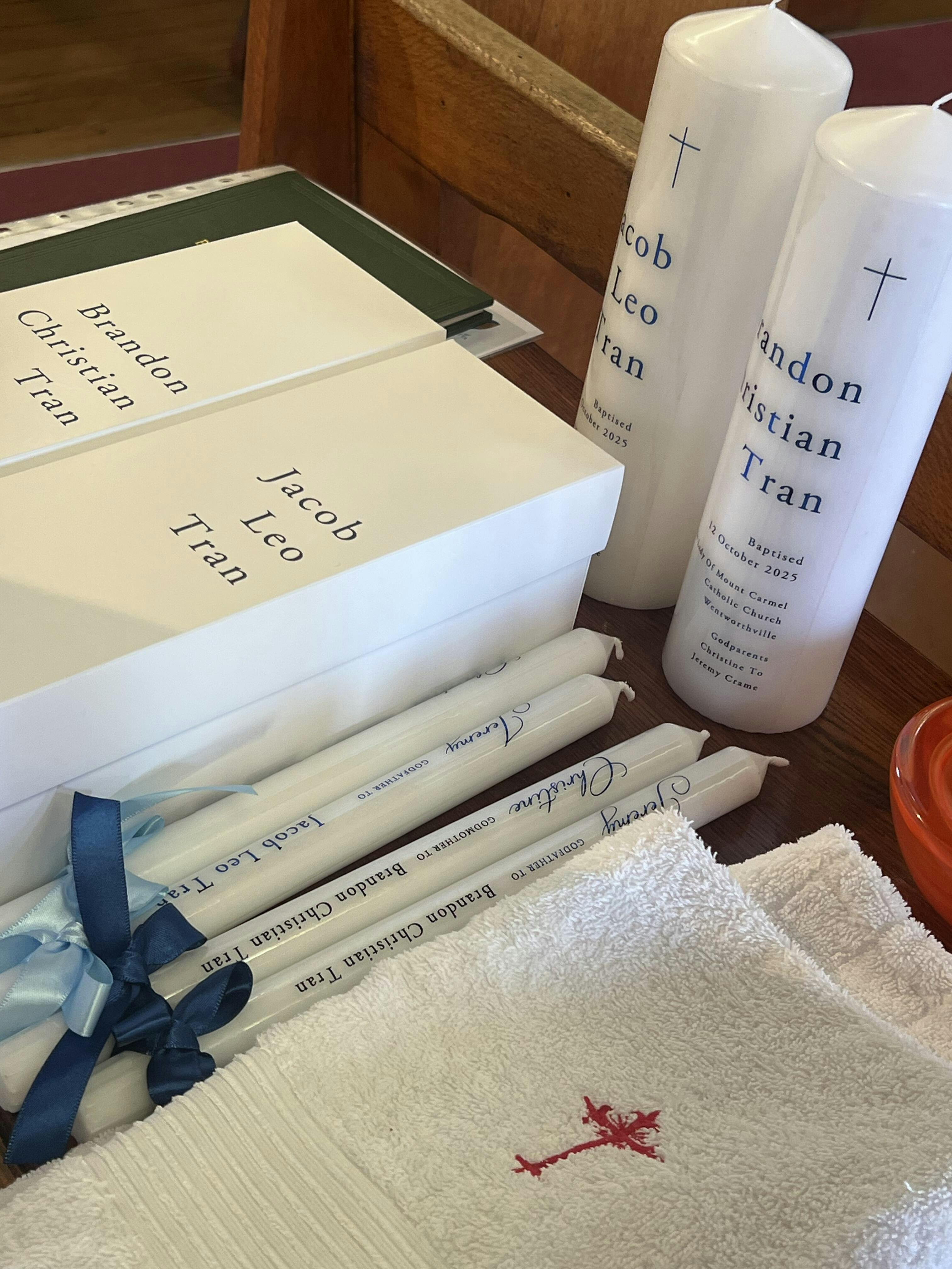 I placed a last minute order for personalised baptism candles, tapered candles and bibles. The team were very responsive and the gifts were absolutely beautiful. I am in Sydney and received the package very well packed So many guests loved the gifts and asked for the details. I highly recommend you place an order, you will not be disappointed